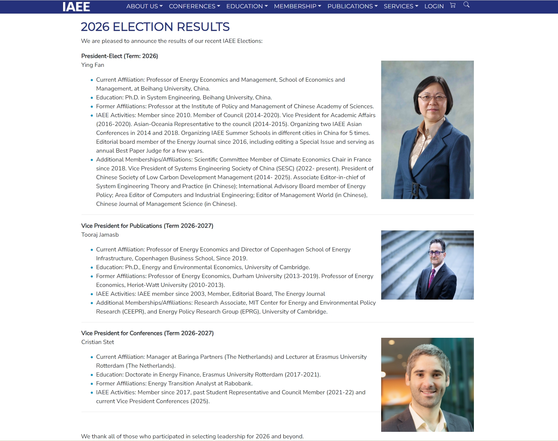 The International Association for Energy Economics (IAEE) has recently announced the results of its 2025 elections. Professor Fan Ying, Dean of the School of Economics and Management at Beihang University and Director of the Lab for Low-Carbon Intelligent Governance of the Ministry of Education, has been elected as the 2026 IAEE President-Elect.