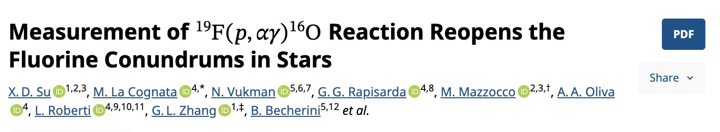Recently, Professor Zhang Gaolong from the School of Physics at Beihang University and collaborators from Italy have made important progress in the study of the astrophysical reaction rate of 19F(p,αγ)16O. The related findings were published online in the physics journal Physical Review Letters on October 29 under the title "Measurement of 19F(p,αγ)16O Reaction Reopens the Fluorine Conundrums in Stars."