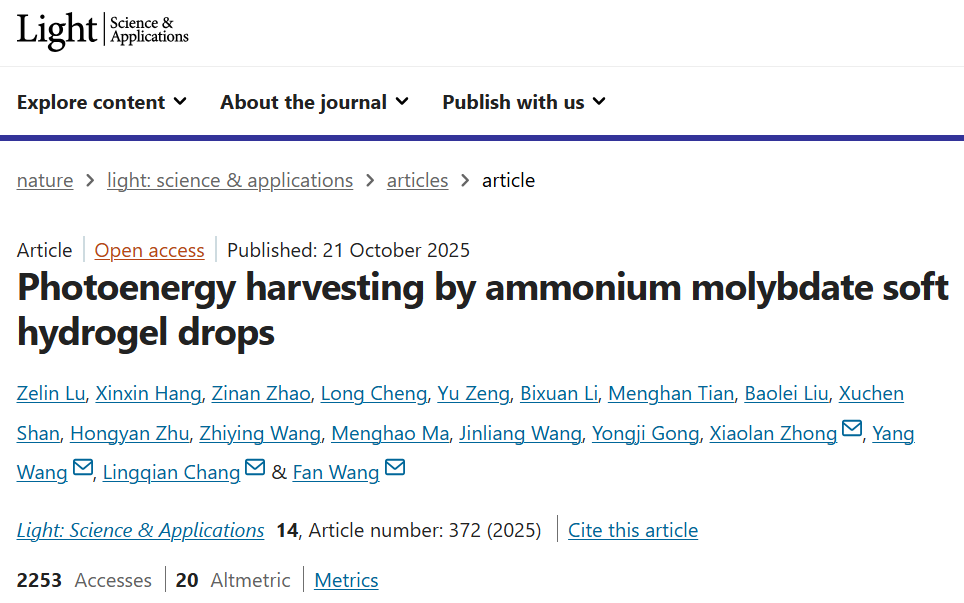 Recently, the research team led by Professor Wang Fan and Professor Zhong Xiaolan from the Nanophotonics Laboratory, School of Physics, Beihang University, has made significant progress in the field of energy conversion based on electron-ion modulation. The related findings, entitled "Photoenergy harvesting by ammonium molybdate soft hydrogel drops," have been published in Light: Science & Applications.