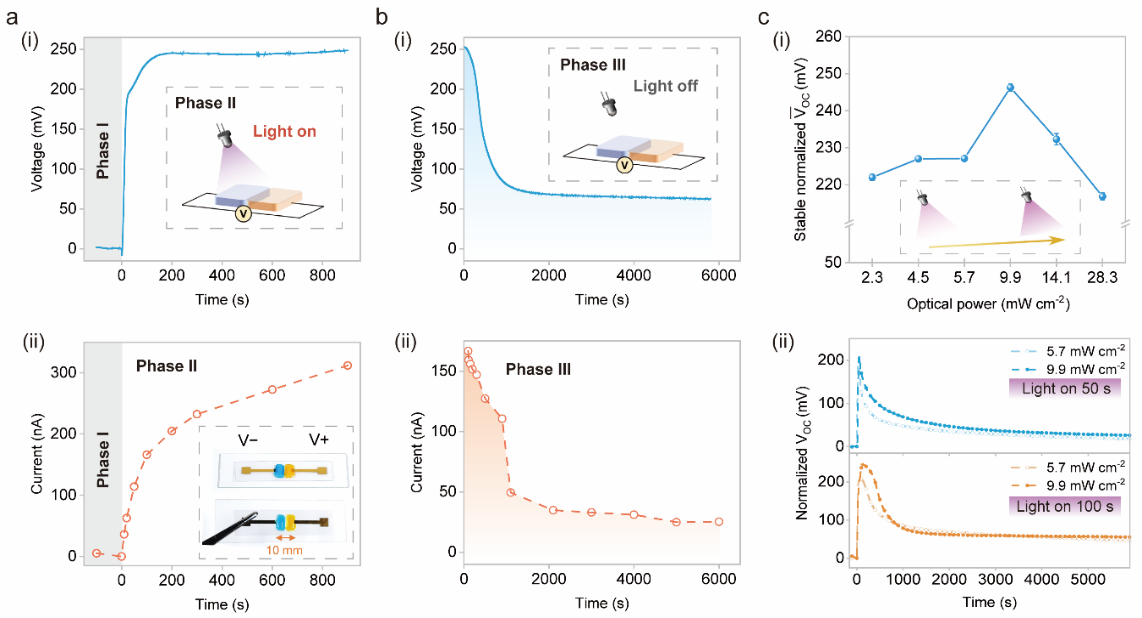 Inspired by energy conversion processes in natural biological systems, the research team has innovatively proposed an ion-hydrogel drops-based photoenergy harvesting device, offering a potential solution to this challenge. This technology generates electricity by utilizing light-induced ion gradients and changes in redox pairs, while the reversible hydrogel network enables the fabrication of arbitrary structures. Experimental results show that when exposed to excitation light, a photo-driven ammonium molybdate-hydrogel photoenergy harvester (PAPH) can generate an open-circuit potential of ~250 mV, and it can still obtain a considerable output power ranging from milliseconds to thousands of seconds after the termination of the initial illumination. The reversible hydrogel droplets network allows for the recovery and fabrication of arbitrary structures of the PAPH.