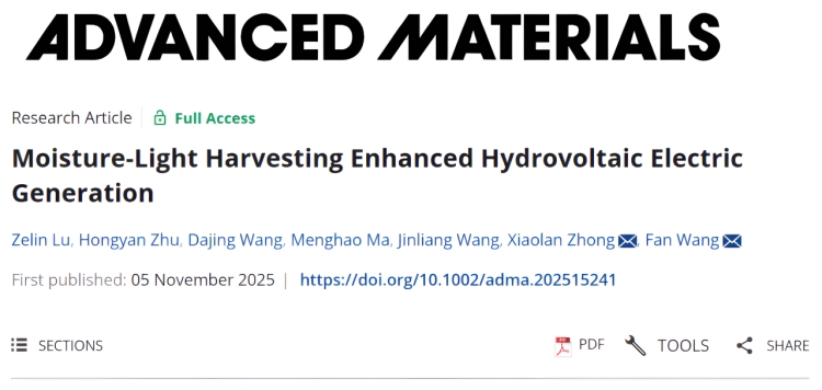 A research team led by Professors Wang Fan and Zhong Xiaolan from the School of Physics at Beihang University has achieved a significant breakthrough in energy conversion technology based on electron-ion modulation. Their work, titled "Moisture-Light Harvesting Enhanced Hydrovoltaic Electric Generation," has been published in the prestigious international journal Advanced Materials. The paper's first author is Lu Zelin, a doctoral student from the School of Physics, with Professors Zhong Xiaolan and Wang Fan serving as the corresponding authors.