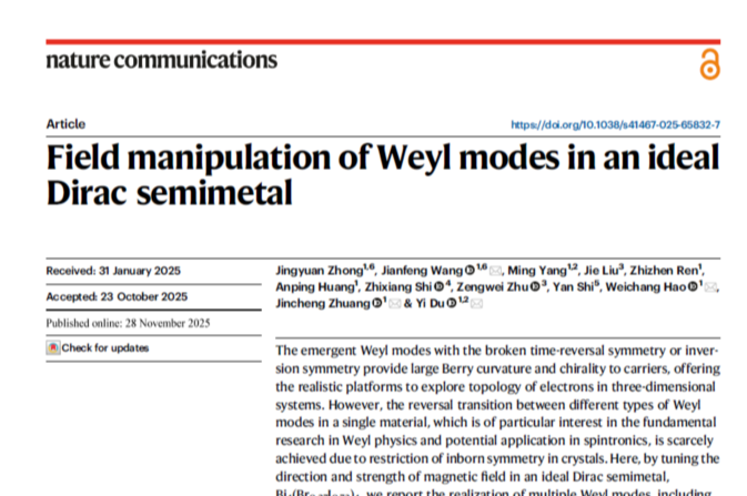Recently, the Surface and Low-Dimensional Physics research group at the School of Physics, Beihang University, in collaboration with Huazhong University of Science and Technology, Southeast University, and other institutions, has made significant progress in realizing multiple Weyl modes. The related research findings were published online in Nature Communications on November 28, 2025, under the title "Field manipulation of Weyl modes in an ideal Dirac semimetal."