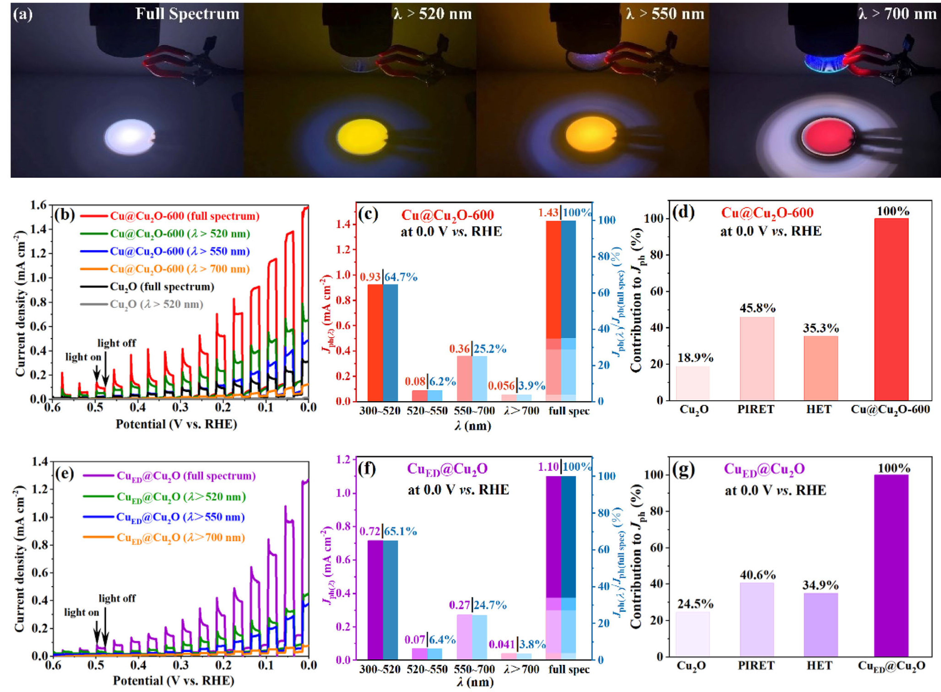 Figure 3. The contributions of PIRET and HET to the photocurrent on Cu2O are quantified by using different bands of incident light