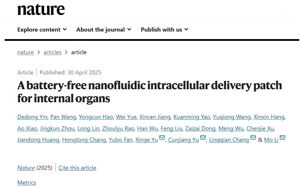 The groundbreaking study, titled “A battery-free nanofluidic intracellular delivery patch for internal organs,” was published in Nature on April 30, 2025, which addresses long-standing challenges in targeted therapy and offers a transformative solution for treating numerous diseases.
