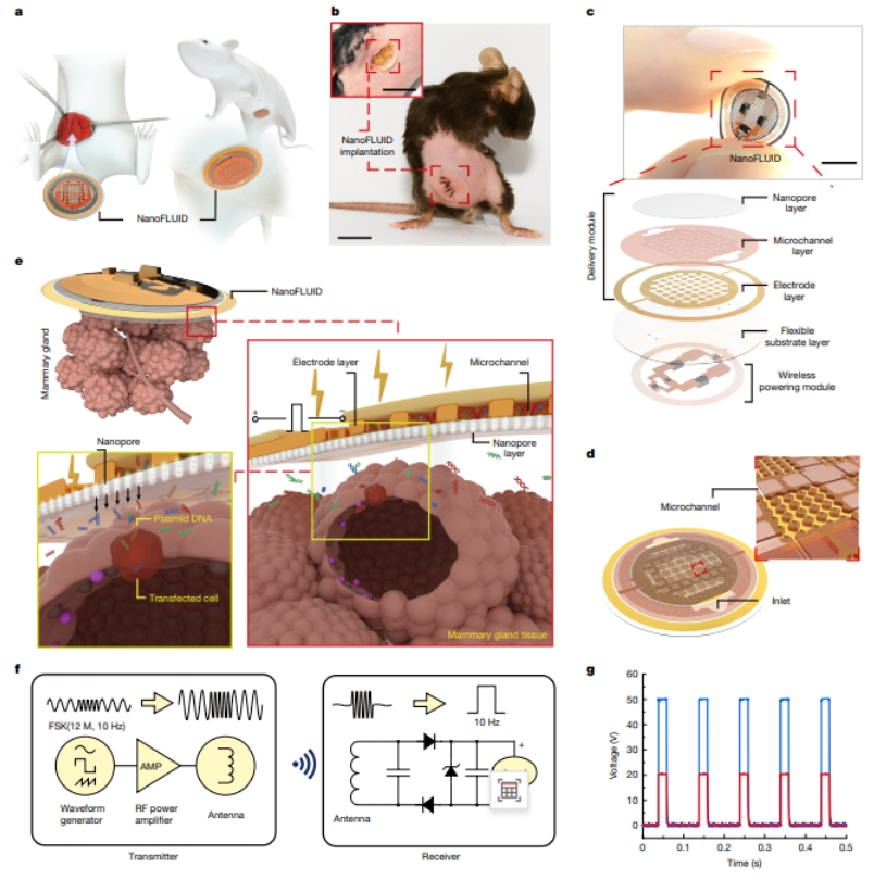 In the research, the authors introduce the NanoFLUID patch, a battery-free, chipless, soft, and wirelessly powered device designed for enhanced accumulation and accelerated intracellular delivery of payloads in targeted internal organs. Its thin, flexible structure combines a nanofluid-based delivery module and a wireless powering module, facilitating seamless integration with organs. The patch employs a nanopore–microchannel–microelectrode structure, operating under low-amplitude pulses (20V) to ensure safe, efficient, and spatiotemporally precise electroperforation of the cell membrane. This method accelerates intracellular payload transport by 104–105 times compared to traditional diffusion-based delivery methods.
