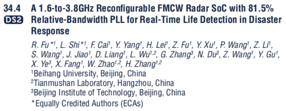 The paper, titled "A 1.6-to-3.8GHz Reconfigurable FMCW Radar SoC with 81.5% Relative-Bandwidth PLL for Real-Time Life Detection in Disaster Response", notes that the chip features a wideband adaptive tunability from 1.6GHz to 3.8GHz and is equipped with a high-bandwidth phase-locked loop (PLL). It enables multi-target motion trajectory tracking and respiratory detection through various obstacles. This technology makes its debut appearance at ISSCC, and is expected to play a crucial role in post-disaster rescue, medical monitoring, anti-terrorism operations, and other fields, providing a high-precision, real-time chip-level solution for life detection in complex environments. The paper is scheduled for presentation in Session 34 and will be demonstrated in the Demo Session.