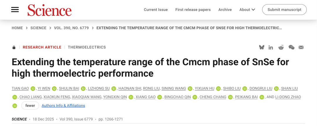 On December 19, 2025, the prestigious journal Science published the latest advances achieved by Professor Zhao Lidong's research group from the School of Materials Science and Engineering of Beihang University in the field of thermoelectric materials and devices.