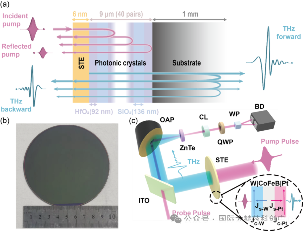 In this paper, the researchers successfully fabricated a three-layer heterostructure of W (2 nm)|Co20Fe60B20 (2 nm)|Pt (2 nm) on a 4 in. high-resistance Si substrate using magnetron sputtering. By ingeniously introducing a broadband one-dimensional photonic crystal (PC) structure [HfO2 (92 nm)|SiO2 (136 nm)]x between the substrate and the heterostructure, efficient utilization of the pump laser and enhancement of the THz emission efficiency are achieved compared to the case without the PC structure.