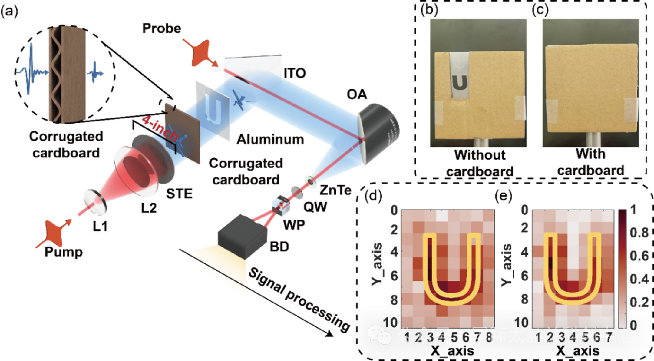 By optimizing the parameters of the spintronic terahertz emitters (STEs) and the pump laser, the research team increased the single-pulse energy of the STEs to a record 1.47μJ, and further constructed a transmissive nondestructive testing imaging system using this sample, imaging a patterned metal plate with and without a corrugated cardboard obstacle. The imaging results demonstrate the potential of this sample for applications in nondestructive testing and related fields.