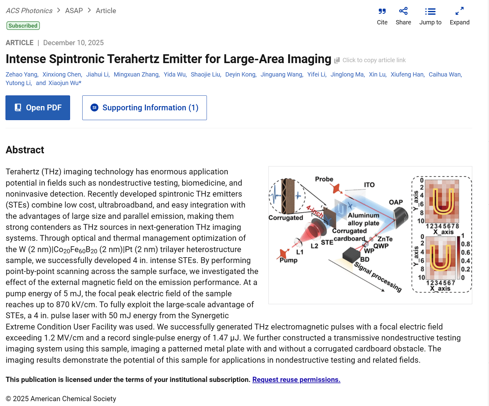 Recently, Professor Wu Xiaojun's team from Beihang University published a research paper titled "Intense Spintronic Terahertz Emitter for Large-Area Imaging" in the high-level journal ACS Photonics, under the American Chemical Society (ACS).
