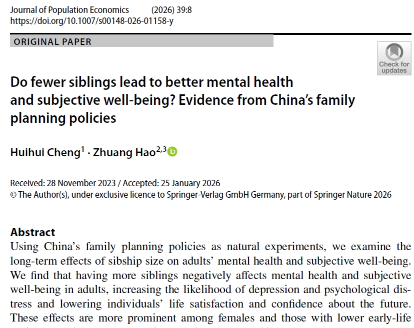 Recently, Associate Professor Hao Zhuang (corresponding author) from the School of Economics and Management at Beihang University, in collaboration with Dr. Cheng Huihui (first author) from Rutgers University, published the research findings titled "Do fewer siblings lead to better mental health and subjective well-being? Evidence from China's family planning policies" in the prestigious Journal of Population Economics.