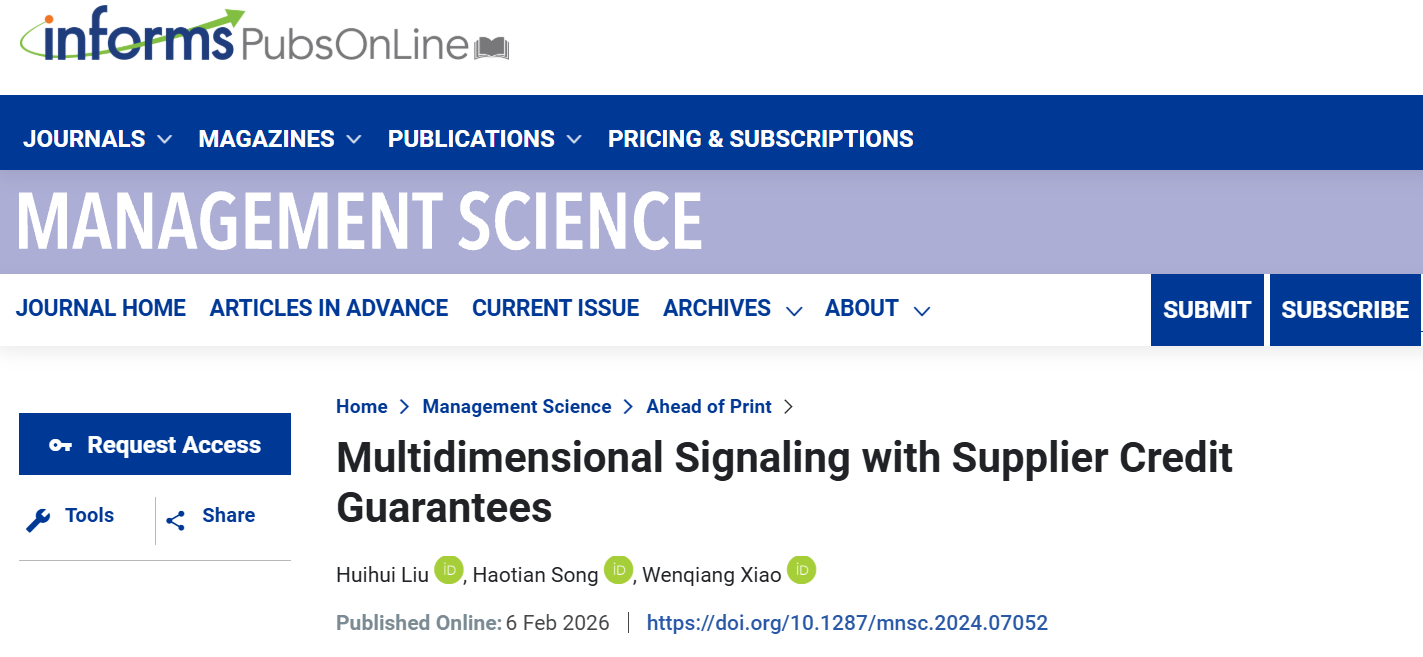 Recently, Associate Professor Liu Huihui from the School of Economics and Management at Beihang University published a research article titled "Multidimensional Signaling with Supplier Credit Guarantee" in the leading international journal Management Science. The paper is co-authored with Song Haotian of Zhejiang University and Xiao Wenqiang of New York University. The study investigates the multifaceted role of credit guarantees and their implications when adopted for financing downstream buyers in a supply chain consisting of a supplier, a capital-constrained buyer, and a bank.