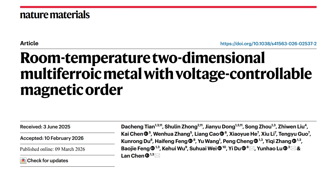 In the relentless pursuit of faster and more energy-efficient information technologies, a research team led by Professor Du Yi from the School of Physics at Beihang University, in collaboration with multiple institutions, has reported a significant breakthrough in the field of multiferroic materials. Their findings, published in the prestigious journal Nature Materials under the title "Room-temperature two-dimensional multiferroic metal with voltage-controllable magnetic order," demonstrate a novel bilayer material that simultaneously exhibits ferroelectricity and magnetism at room temperature, with strong coupling between the two properties.