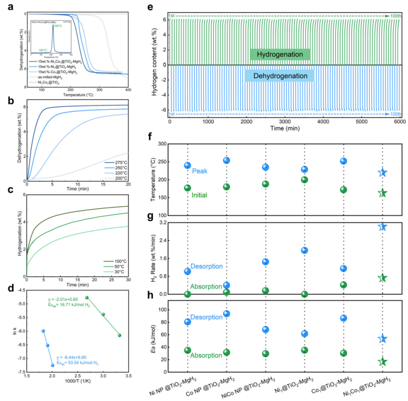 The ball-milled Ni1Co1@TiO2-MgH2 composite achieved a low initial dehydrogenation temperature (168 °C), with an accelerated initial hydrogen desorption rate of 3.02 wt.%·min−1at 275 °C, while enabling efficient room-temperature hydrogen absorption (3.79 wt.% within 30 min at 30 °C). The system exhibited outstanding kinetics, showing low Ea for desorption and absorption, and maintained 97.6% capacity retention over 100 de/hydrogenation cycles. This work enhanced hydrogen storage performance in MgH2-based systems while proposing a universal design framework for reversible chemical processes.