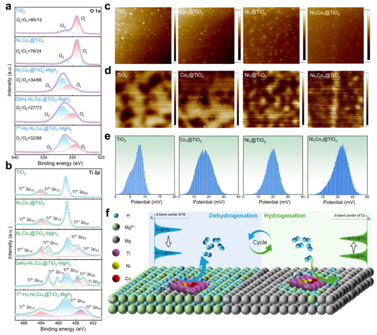 The researchers rationally design and construct a heteronuclear dual-atom catalyst, Ni1Co1@TiO2. In this system, Ni and Co bidirectionally modulate the d-band centres, enabling synergistic and complementary catalysis. Specifically, Ni serves as the primary active site for Mg–H bond cleavage during dehydrogenation, facilitated by the Co-induced d-band centre downshift. Conversely, Co acts as the primary active site for H2 dissociation during hydrogenation via the Ni-triggered d-band centre upshift. Simultaneously, self-reconstruction of titanium species and oxygen vacancies (OV), coupled with strong metal-support interactions (Ni/Co–TiO2), accelerates interfacial electron transfer and inhibits metal atom migration. This synergy significantly enhances both reaction kinetics and cycling stability, showing great promise for large-scale hydrogen-storage applications.