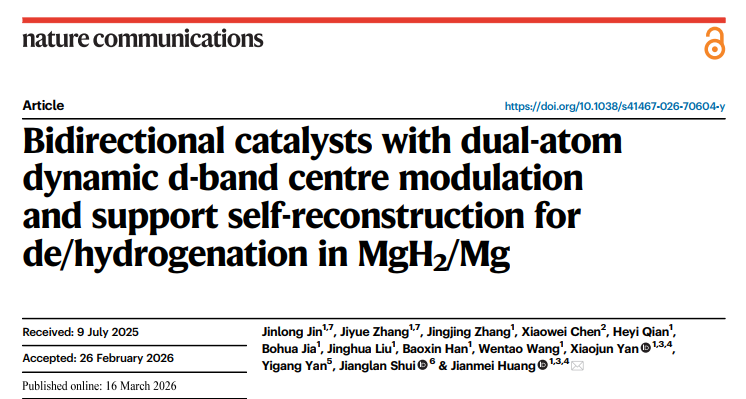 Recently, a collaborative team led by Associate Professor Huang Jianmei and Professor Yan Xiaojun from the School of Energy and Power Engineering at Beihang University, together with Professor Shui Jianglan from the School of Materials Science and Engineering, reported a Ni/Co heteronuclear dual-atom catalyst supported on a TiO2 carrier, achieving efficient bidirectional catalysis in the MgH2/Mg hydrogen storage system. The related findings were published in Nature Communications under the title "Bidirectional catalysts with dual-atom dynamic d-band centre modulation and support self-reconstruction for de/hydrogenation in MgH₂/Mg."