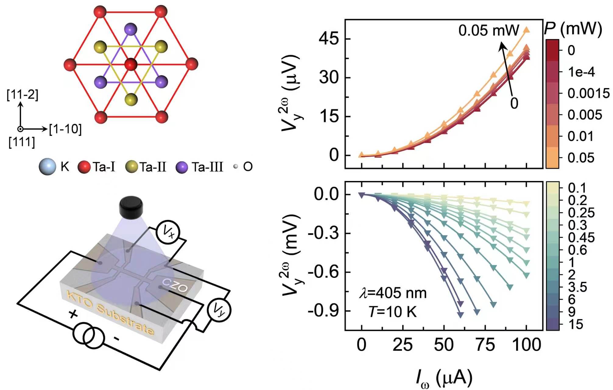 The research team, in collaboration with teams from the Institute of Physics, Chinese Academy of Sciences, and the Quantum Science Center of Guangdong-Hong Kong-Macao Greater Bay Area (Guangdong), report a light-induced giant enhancement of the NLHE in the 2D electron gas (2DEG) at the CaZrO3/KTaO3 (111) interface. Under illumination, the second harmonic Hall voltage increases substantially and undergoes a sign reversal. Correspondingly, the second-order transverse conductivity (σ(2) yxx) increases by nearly five orders of magnitude, reaching 2.4 µm V−1 Ω−1, while also reversing its sign. Scaling analysis identifies skew scattering as the dominant mechanism, which is highly tunable via optical gating. Photoexcitation pumps electrons from in-gap states into the Ta 5d conduction band, generating high-mobility photocarriers that increase the cubic scattering time (τ3) and thereby, dramatically boost σ(2) yxx. First-principles calculations further reveal that the Berry curvature triple changes sign as the Fermi level approaches the higher-lying Lz,+ subbands, in the Ta 5d accounting for the observed sign reversal. The work offers a new strategy to optically control the NLHE in oxide 2DEG systems, highlighting the tunability of nonlinear transport by optical excitation.
